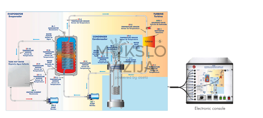 Sistema leidžia praktiškai nagrinėti, kaip garo srautas, temperatūra ir slėgis veikia išgaunamą galią. Išvesties energija tiekiama į rezistorių, o galia matuojama vatmetru. Garų srautas vertinamas pagal kondensuoto garo tūrį per tam tikrą laiką.