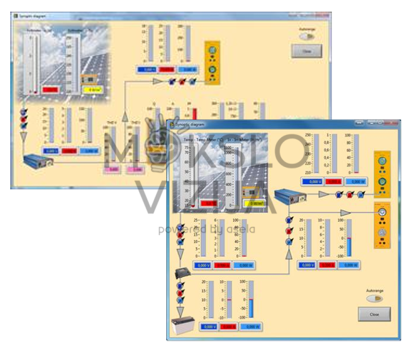 Komplekte esantis reguliuojamo pasvirimo fotovoltinis modulis (apie 90 W, 12 V) turi integruotą spinduliuotės matavimo celę ir temperatūros jutiklį. Vidaus bandymams skirtas halogeninių lempų pagrindu veikiantis saulės simuliatorius. Matavimo modulis leidžia registruoti spinduliuotę iki 1000 W/m², modulio temperatūrą iki 400 °C, nuolatinės srovės galią (iki 65 V, 30 A, 1000 W) ir kintamosios srovės galią (iki 512 V, 30 A, 1000 W). Sistema taip pat turi trijų fazių galios analizatorių, matuojantį įtampą, srovę, dažnį, aktyviąją, reaktyviąją ir tariamąją galią.