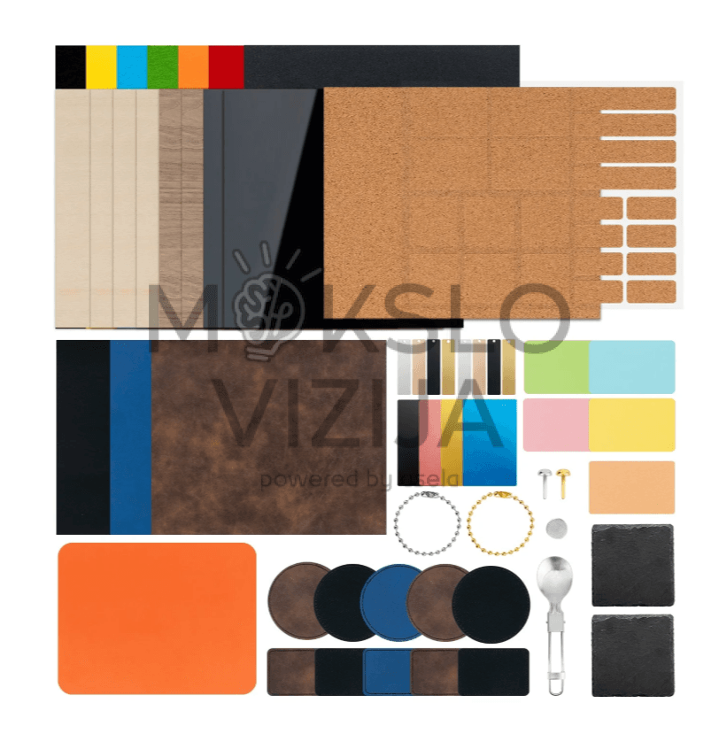 Lazerinių medžiagų pažintinis rinkinys skirtas susipažinti su skirtingų medžiagų pjovimo ir graviravimo savybėmis praktinių bandymų metu. Rinkinyje pateikiama kruopščiai atrinkta įvairių medžiagų kolekcija, leidžianti išbandyti skirtingus nustatymus, palyginti rezultatus ir suprasti, kaip lazeris veikia medį, akrilą, odos pakaitalus ir kitas dažniausiai naudojamas medžiagas.