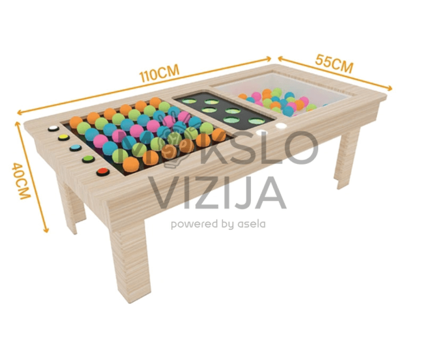 Tai kūrybiškai suprojektuotas sensorinis stalas, skirtas vaikams tyrinėti spalvas, šviesą ir formas. Jis apjungia kelias žaidimo patirtis vienoje erdvėje ir lavina motoriką, kūrybiškumą bei sensorinį suvokimą.