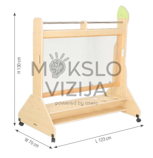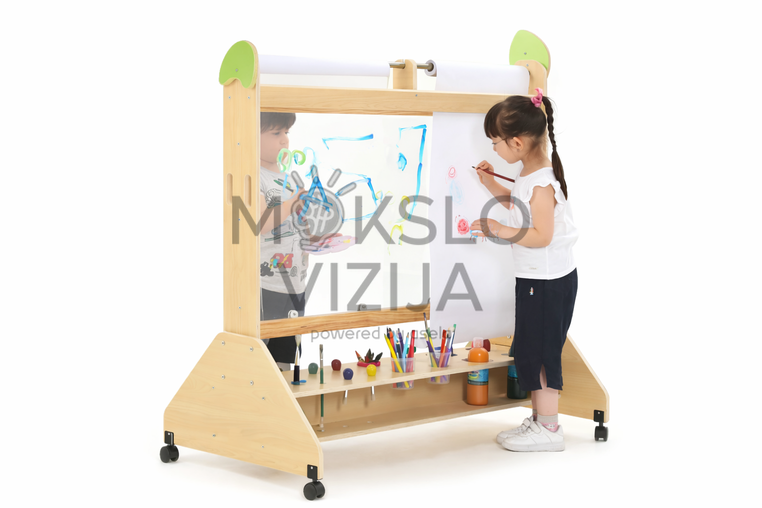 Patogi konstrukcija su vieta piešimo priemonėms leidžia viską laikyti vienoje vietoje, o mobilumas su užrakinamais ratukais užtikrina lengvą perstatymą ir stabilumą naudojimo metu. Tvirta ir kokybiška konstrukcija pritaikyta intensyviam kasdieniam naudojimui ugdymo įstaigose ar namuose.
