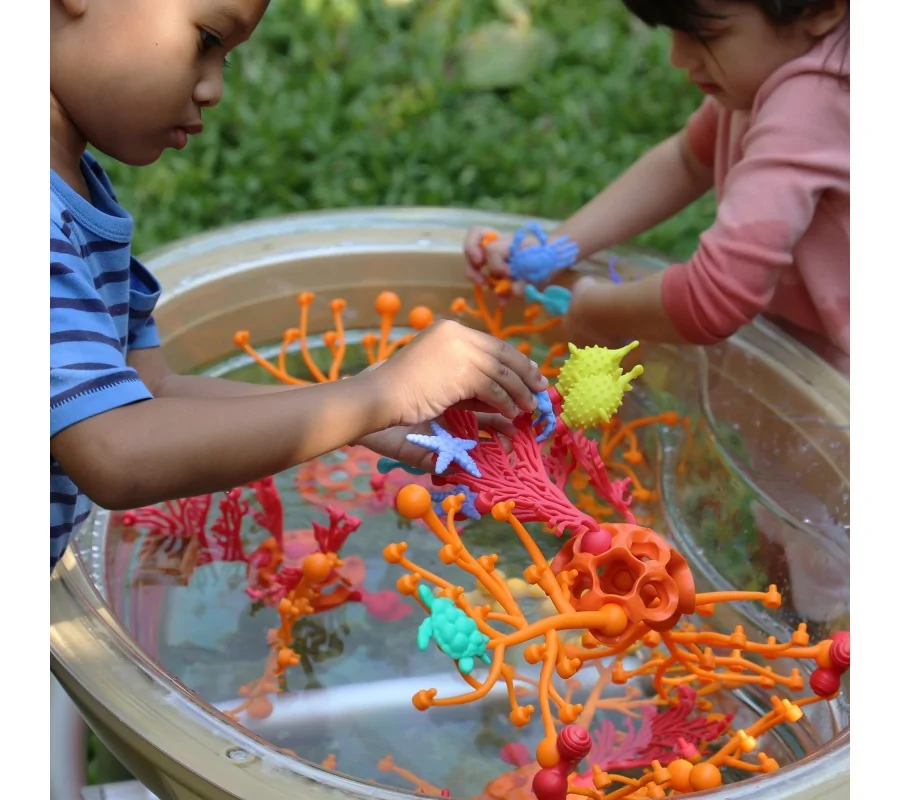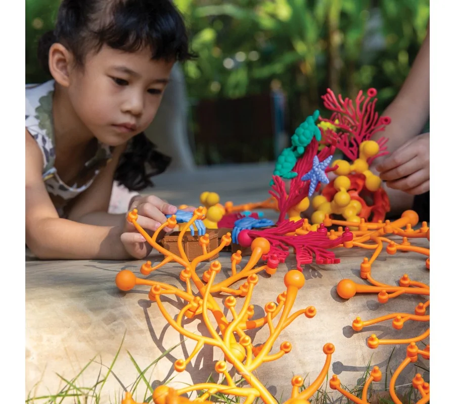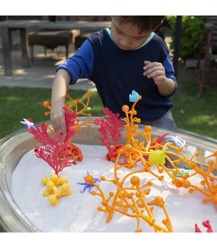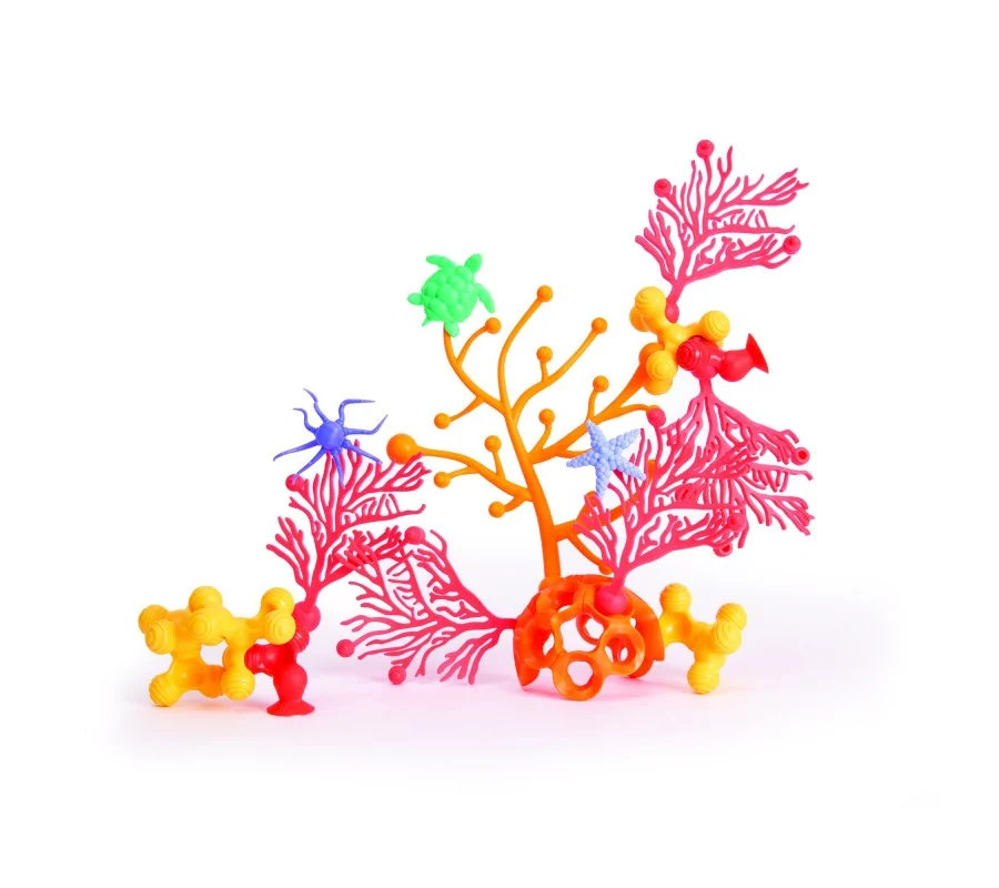 40 spalvingų koralinio rifo formos kaladėlių rinkinys. Pagaminti iš minkšto, lankstaus plastiko, visiškai saugus naudoti. Blokeliai turi rutulines jungtis, todėl iš turimų blokelių galima kurti įmantrias struktūras, imituojančias realius, gražius koralų rifus. Taip sukonstruotą rifą galima patalpinti, pavyzdžiui, akvariume. Žaislas lavina vaiko vaizduotę ir motorinius įgūdžius.