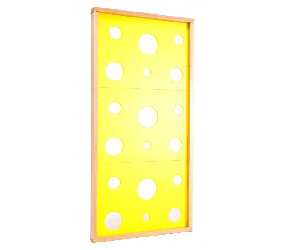Geltoną sūrį imituojanti laipiojimo sienelė – puiki alternatyva tradicinėms sienoms, dėl kurios mūsų terapijos kambarys, sporto salė ir žaidimų aikštelė taps patrauklesni. Sienelės rėmas pagamintas iš buko faneros pagal specialų mūsų užsakymą. Dėl to ji gražiai atrodo kambaryje, o jos kokybė užtikrina ilgaamžiškumą.