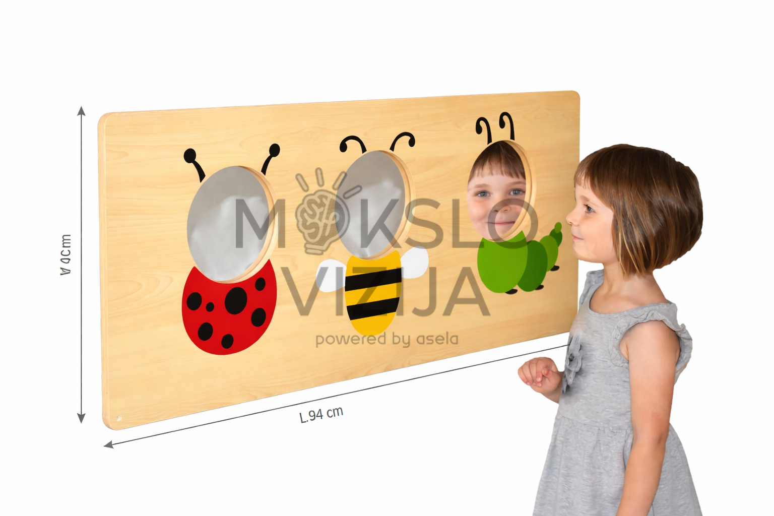 Sieninis elementas su veidrodžiais sukurtas taip, kad skatintų vaikų kūrybiškumą, saviraišką ir socialinius įgūdžius. Veidrodinis paviršius leidžia vaikams stebėti save, įsijausti į įvairius vaidmenis ir kurti skirtingas situacijas žaidimo metu.