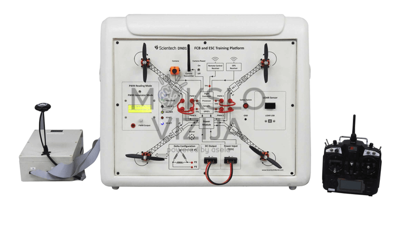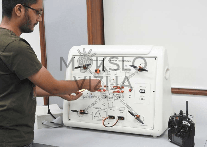 Platforma veikia dviem režimais – prijungta prie elektros tinklo arba naudojant bateriją – todėl tinka tiek laboratoriniam mokymui, tiek praktinėms dirbtuvėms, kai reikalingas mobilumas. Integruotas pažangus mikroprocesorius, keli PWM ir servo tipo išėjimai, ryšio magistralių sąsajos UART, I2C ir SPI, atsarginis maitinimo šaltinis bei specializuotos sąsajos kamerai, variklio testeriui, baterijos įkrovimui, LiDAR jutikliui ir saugos jungikliui sudaro pilną mokymosi aplinką, kurioje galima saugiai ir kontroliuojamai atlikti praktines užduotis. Komplektacijoje numatyti reikalingi sujungimo laidai, GPS modulis su stovu, propeleriai ir jų tvirtinimai, RC valdymo pultas su baterijomis, baterijos įkrovimo kabelis, kameros imtuvas, maitinimo laidai ir USB kabelis, todėl mokymo procesą galima pradėti iš karto. Tai mokymo sprendimas, skirtas sistemingai parengti mokinius praktiniam darbui su dronų sistemomis ir padėti jiems tapti konkurencingais specialistais modernių technologijų darbo rinkoje.