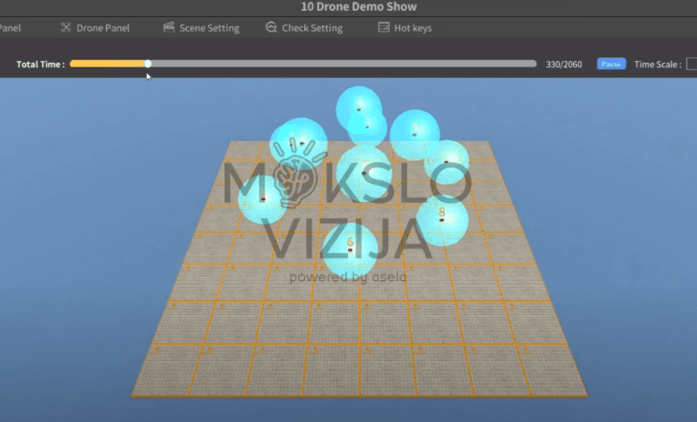 Edukacinis sprendimas sinchronizuotiems dronų šviesų šou patalpose