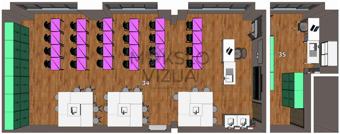 Šiame brėžinyje pavaizduotas mūsų pačių suprojektuotas chemijos kabineto su paruošiamuoju patalpos sprendimas, skirtas saugiam ir efektyviam chemijos mokymui bei praktiniams laboratoriniams darbams. Brėžinys parengtas naudojant mūsų projektuojamus ir tiekiamus laboratorinius baldus, todėl visa erdvė suplanuota kaip vientisa ir funkcionali sistema, atitinkanti ugdymo įstaigų poreikius.