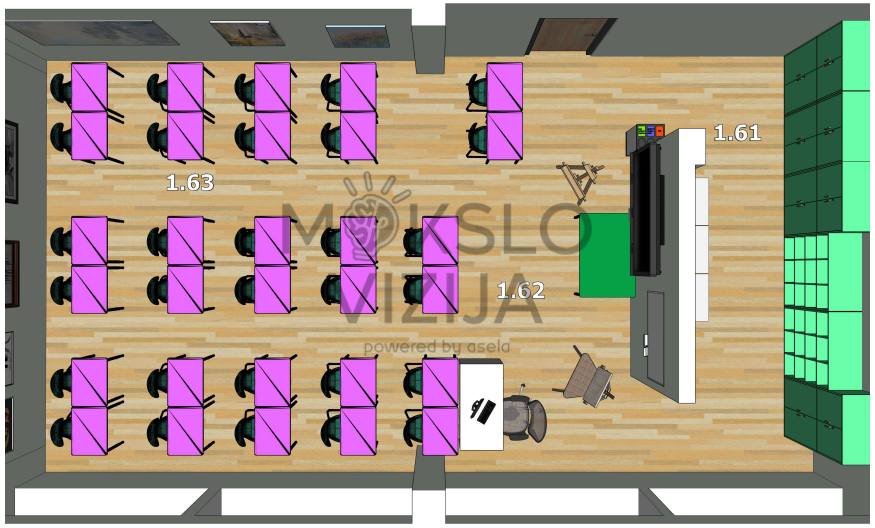 Mes siūlome jau paruoštus dailės klasių komplektus, pritaikytus konkrečiam mokinių skaičiui, ugdymo programai ir patalpų išplanavimui. Šiame brėžinyje pateiktas sprendimas yra pavyzdinis ir gali būti lengvai adaptuojamas pagal individualius poreikius, keičiant darbo vietų konfigūraciją, baldų išdėstymą ar integruojamą įrangą.