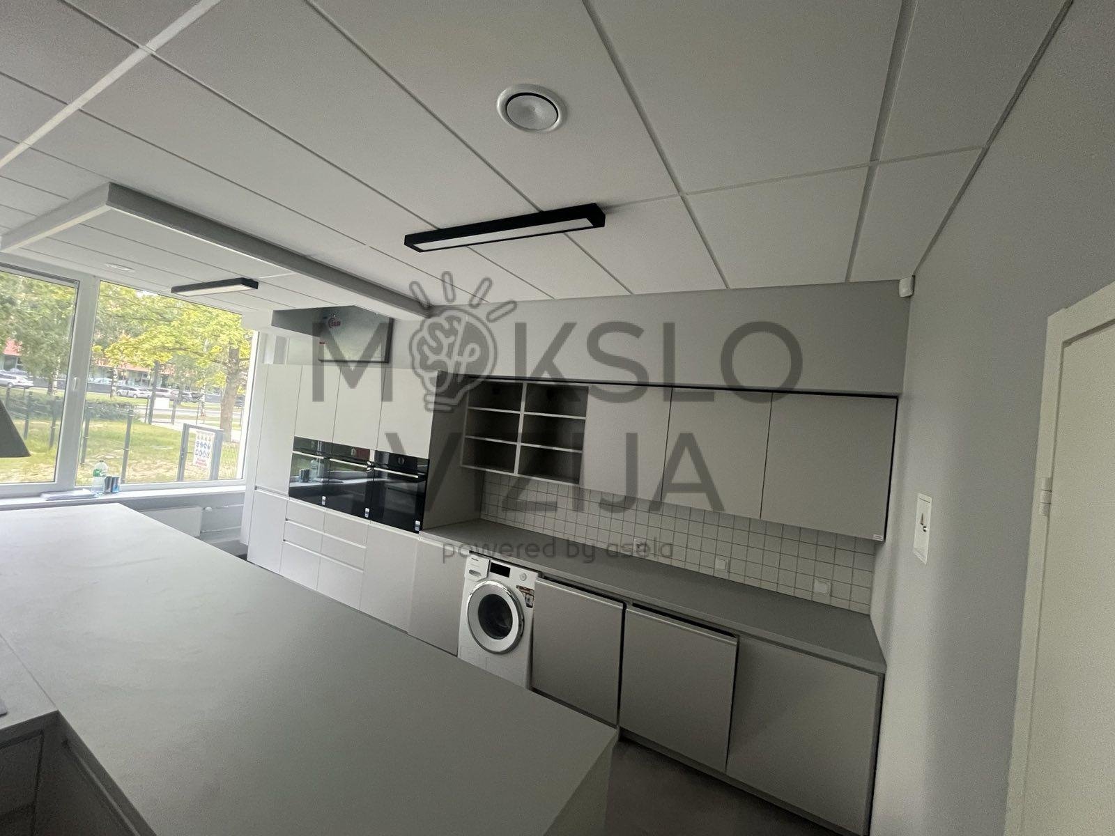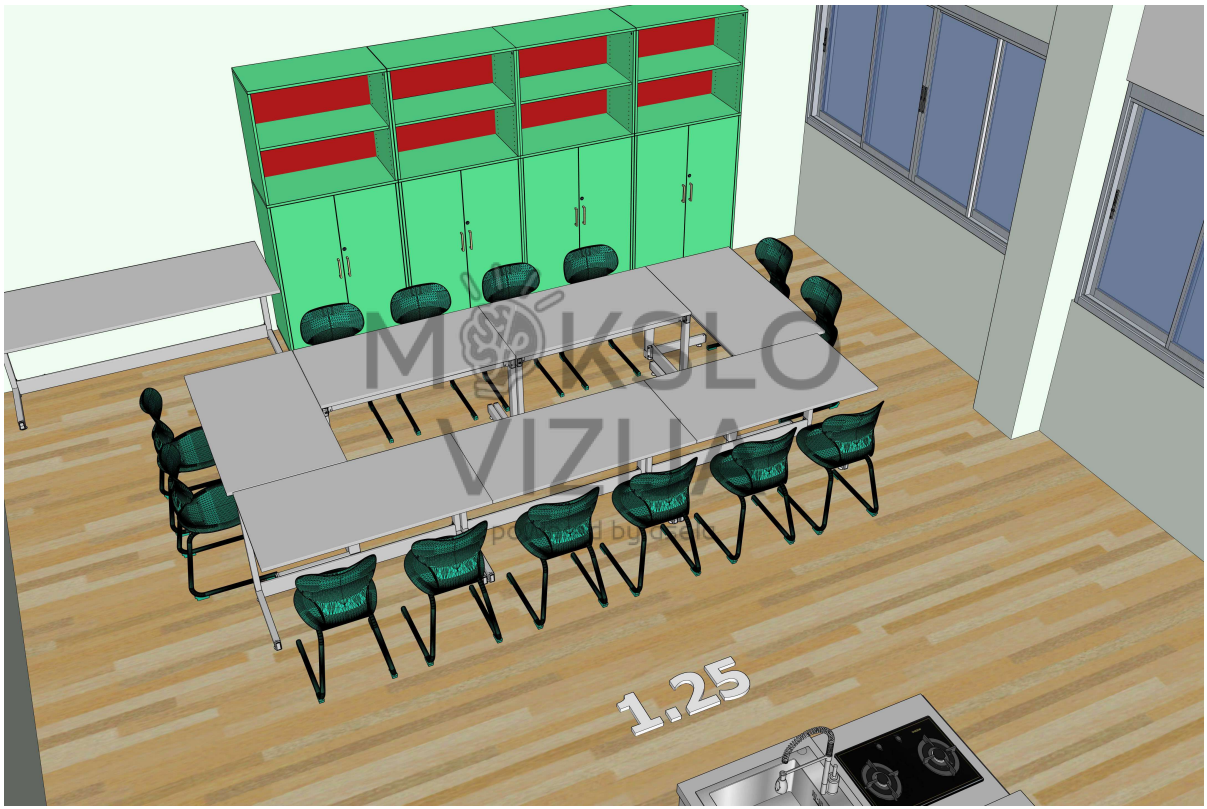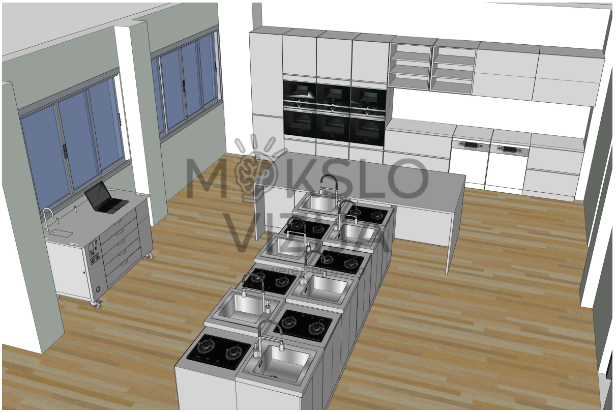 Šalia esanti erdvė pritaikyta grupiniam darbui, diskusijoms ir rezultatų aptarimui. U formos stalų išdėstymas sudaro sąlygas bendradarbiavimui, mokytojo demonstracijoms ir aktyviam mokinių įsitraukimui į ugdymo procesą. Perimetru išdėstyti laikymo baldai skirti kūrybinėms priemonėms, STEAM įrangai ir medžiagoms laikyti, padedant palaikyti tvarką ir saugią darbo aplinką.