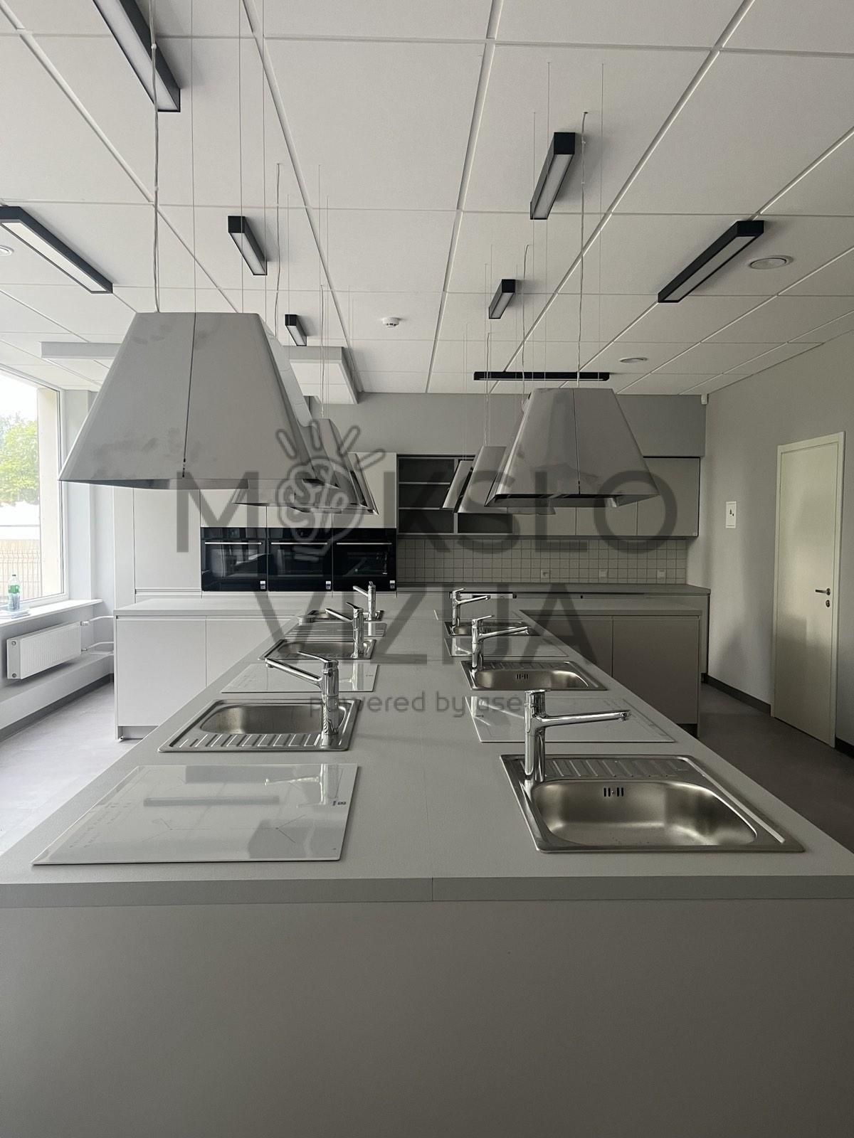 Praktinėje STEAM erdvėje numatytos specializuotos darbo zonos, leidžiančios mokiniams atlikti technologinius, kūrybinius ir eksperimentinius darbus. Centrinėje zonoje suplanuotos darbo salelės su integruota įranga, pritaikyta praktinėms užduotims, bandymams ir projektiniam darbui. Toks išplanavimas leidžia vienu metu vykdyti kelias skirtingas veiklas, išlaikant aiškią struktūrą ir patogų judėjimą erdvėje.
