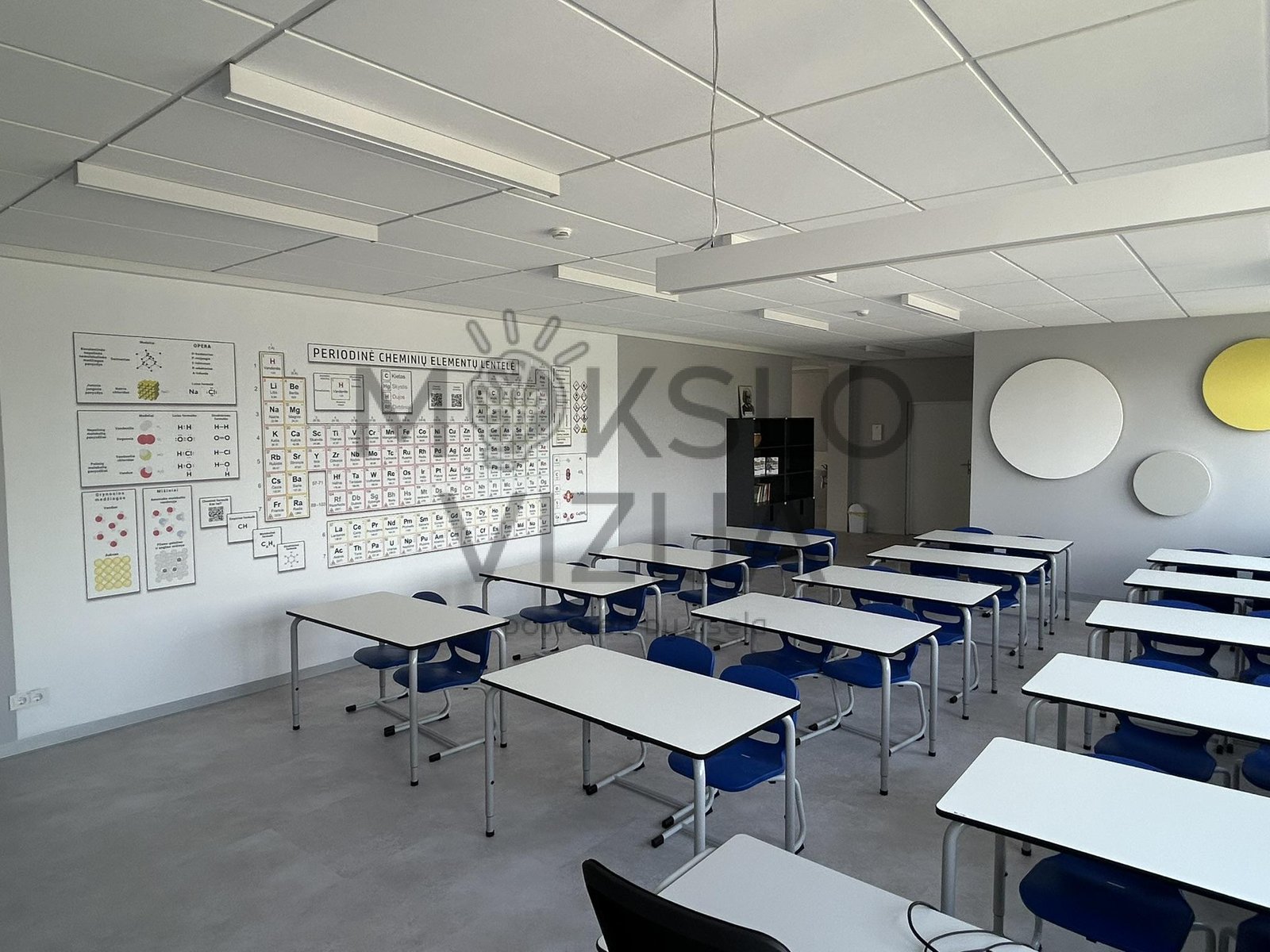Pagrindinėje edukacinėje erdvėje darbo vietos išdėstytos eilėmis, sudarant sąlygas patogiam individualiam ir poriniam darbui, teoriniams pristatymams, diskusijoms ar kūrybinėms užduotims. Toks išplanavimas leidžia lengvai organizuoti pamokos eigą, užtikrina gerą matomumą ir aiškius praėjimus judėjimui klasėje. Mokytojo darbo vieta suplanuota taip, kad būtų patogu koordinuoti veiklas ir stebėti mokinių darbą visoje erdvėje.