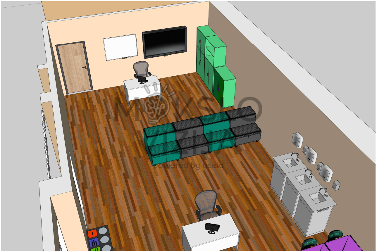 Perimetru išdėstytos techninės ir laikymo zonos skirtos kūrybinėms priemonėms, įrangai ir mokymo medžiagai laikyti, padedant palaikyti tvarką ir saugią darbo aplinką. Mokytojo darbo vietos suplanuotos taip, kad būtų patogu koordinuoti veiklas, konsultuoti dalyvius ir stebėti visą erdvę.
