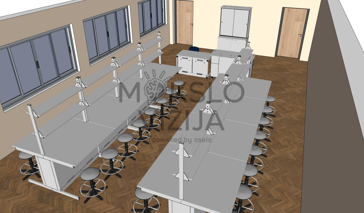 Laboratorijoje suplanuotos dvi centrinės mokinių darbo zonos su keturviečiais laboratoriniais stalais, leidžiančiais mokiniams dirbti grupėmis, atlikti eksperimentus, stebėjimus ir praktines užduotis. Prie stalų numatytos mobilios taburetės su ratukais, kurios suteikia lankstumo judėjimui ir leidžia greitai keisti darbo pozicijas pagal veiklos pobūdį.
