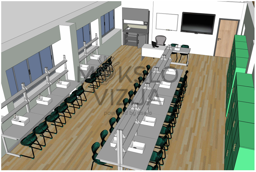 Perimetru išdėstytos spintelės ir laikymo sprendimai skirti mokymo priemonėms, laboratorinei įrangai ir eksperimentinėms medžiagoms laikyti, padedant palaikyti tvarką ir saugią darbo aplinką. Mokytojo darbo vieta suplanuota taip, kad būtų patogu valdyti pamokos eigą, atlikti demonstracinius bandymus ir stebėti mokinių darbą visoje klasėje.