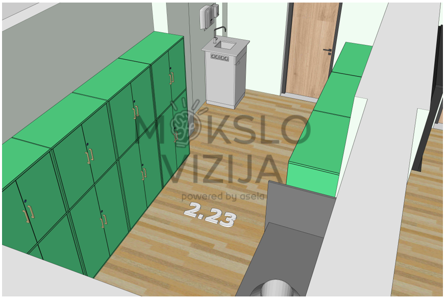 Šiame brėžinyje pavaizduotas mūsų pačių suprojektuotas gamtos mokslų kabineto (kab. Nr. 2.22) ir paruošiamosios patalpos (kab. Nr. 2.23) sprendimas, skirtas integruotam gamtos mokslų ugdymui ir saugiam praktinių veiklų organizavimui. Brėžinys parengtas naudojant mūsų projektuojamus ir tiekiamus laboratorinius baldus, todėl abi erdvės suplanuotos kaip vientisa, tarpusavyje suderinta sistema.