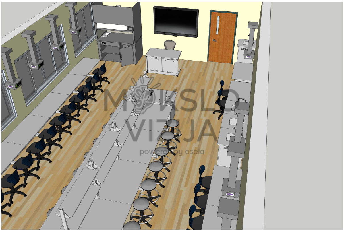 Klasėje numatytos ergonomiškos mokinių darbo vietos, centriniai laboratoriniai stalai bei demonstracinė zona, leidžianti patogiai organizuoti pamokas, eksperimentus ir grupinius darbus. Stalų išdėstymas užtikrina aiškius praėjimus, gerą matomumą ir saugų judėjimą visoje patalpoje, o mokytojo darbo vieta suplanuota taip, kad būtų patogu valdyti pamokos eigą ir stebėti mokinių veiklą.