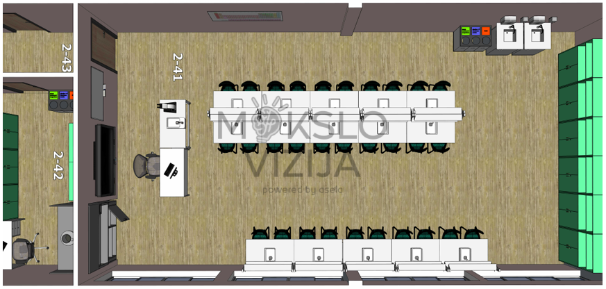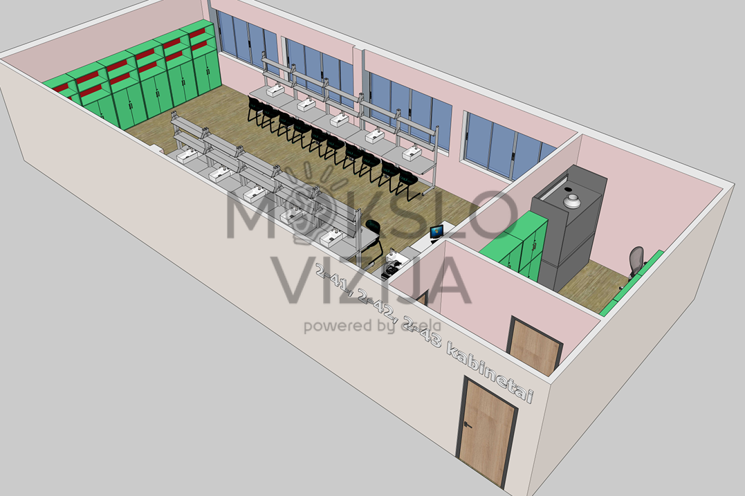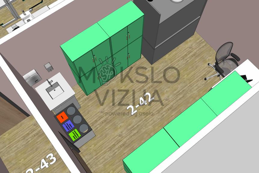 Šiame brėžinyje pavaizduotas mūsų pačių suprojektuotas gamtos mokslų laboratorijos (kab. Nr. 2-41) ir mokytojo pasiruošimo kambario (kab. Nr. 2-42) sprendimas, skirtas saugiam, patogiam ir efektyviam gamtos mokslų ugdymui. Brėžinys parengtas naudojant mūsų projektuojamus ir tiekiamus laboratorinius baldus, todėl abi patalpos suplanuotos kaip vientisa, tarpusavyje suderinta sistema.