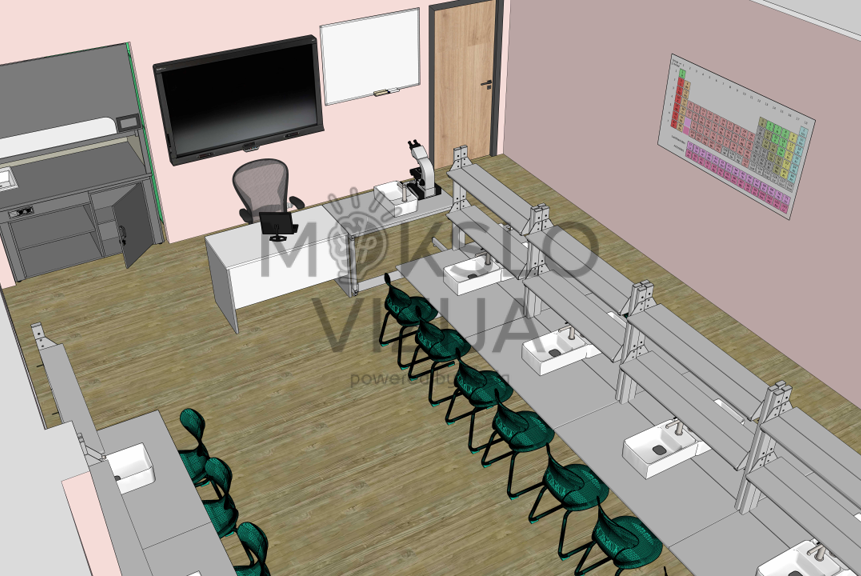 Perimetru išdėstytos spintelės ir laikymo sprendimai skirti reagentams, laboratorinei įrangai ir mokymo priemonėms laikyti, padedant palaikyti tvarką ir užtikrinti saugų darbo procesą. Mokytojo darbo vieta laboratorijoje suplanuota taip, kad būtų patogu koordinuoti veiklas, stebėti mokinių darbą ir atlikti demonstracinius bandymus.