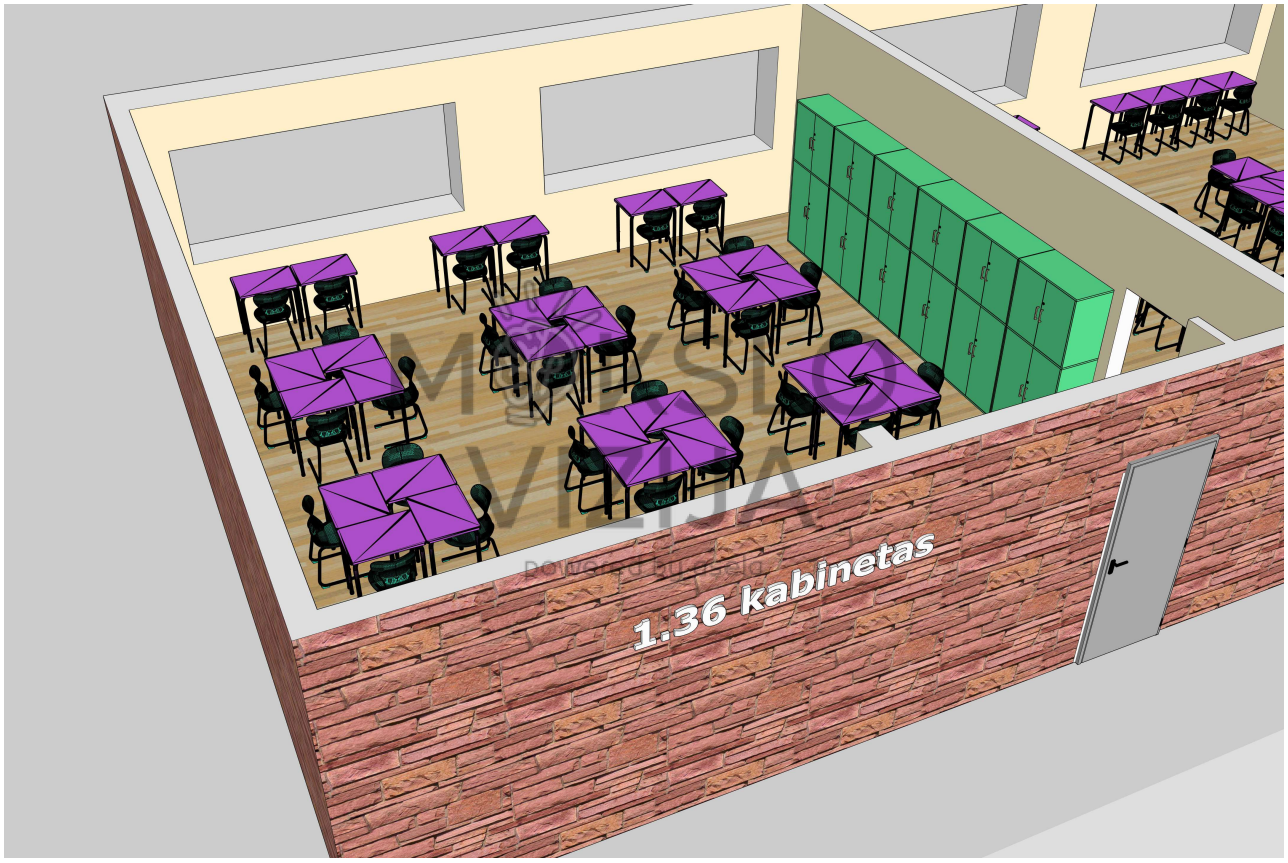 Perimetru išdėstytos spintelės ir laikymo sprendimai skirti reagentams, laboratorinei įrangai ir eksperimentinėms priemonėms laikyti, padedant palaikyti tvarką ir užtikrinti saugų darbo procesą. Mokytojo darbo vieta ir demonstracinė zona suplanuotos taip, kad būtų patogu koordinuoti veiklas, pristatyti tyrimų eigą ir prižiūrėti mokinių darbą visoje laboratorijoje.