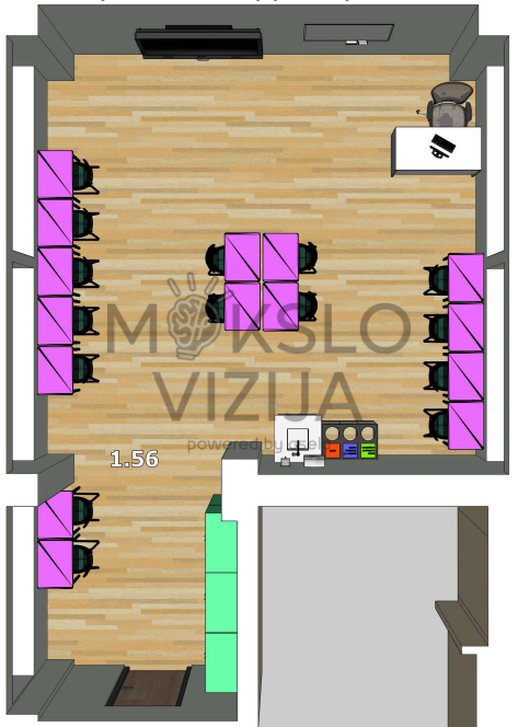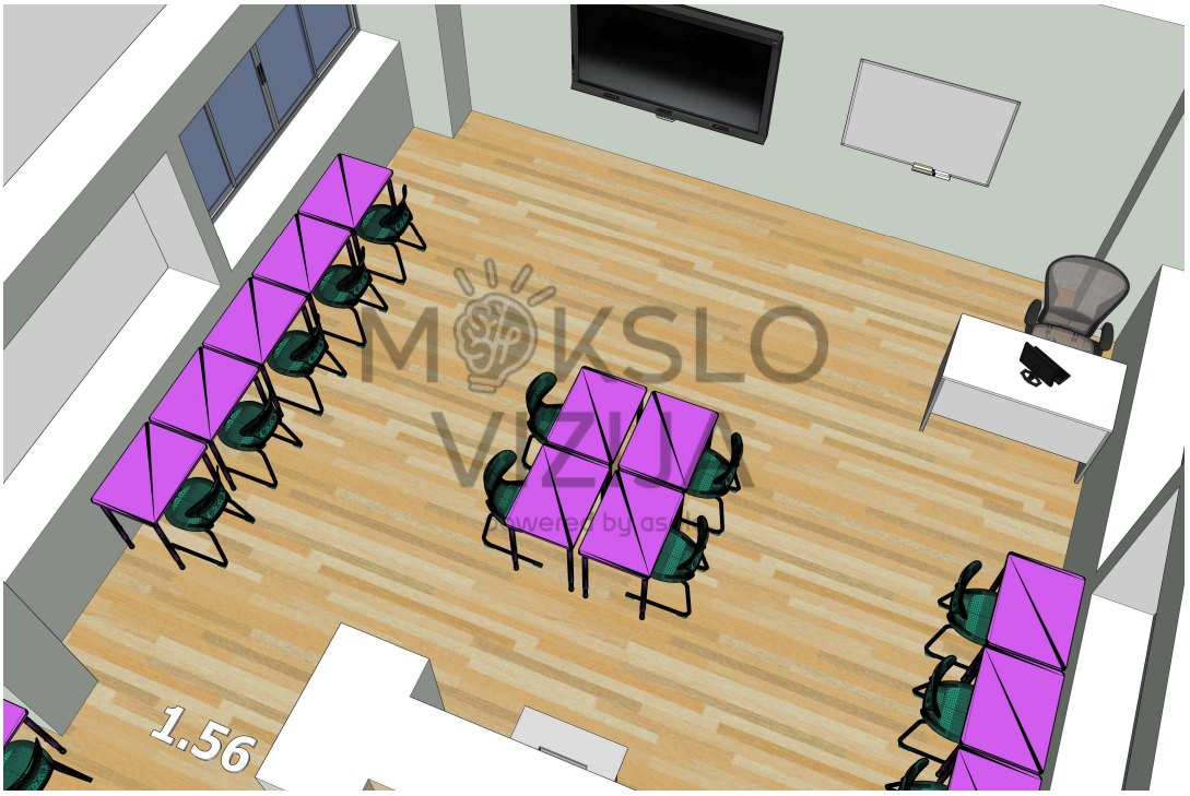 Darbo vietos išdėstytos taip, kad mokiniai galėtų patogiai dirbti individualiai arba poromis, o mokytojas turėtų gerą matomumą į mokinių ekranus ir galėtų lengvai judėti klasėje. Centrinė darbo zona leidžia lanksčiai organizuoti veiklas, derinti individualų darbą su grupinėmis užduotimis ar trumpomis diskusijomis.