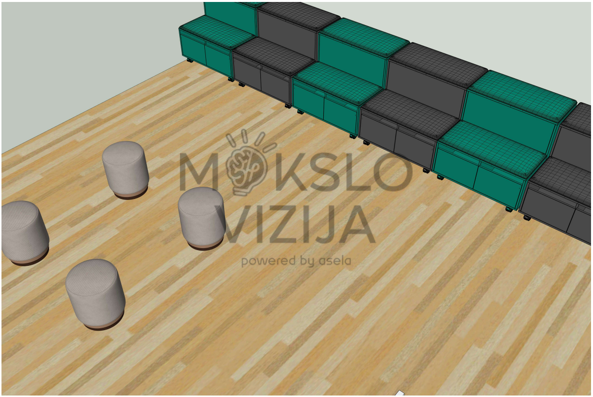 Šiame brėžinyje pavaizduotas mūsų pačių suprojektuotas neformalios erdvės sprendimas, skirtas poilsiui, neformaliam mokymuisi, diskusijoms, komandiniam darbui ir trumpoms edukacinėms veikloms. Brėžinys parengtas naudojant mūsų projektuojamus ir tiekiamus baldus, todėl visa erdvė suplanuota kaip lanksti, funkcionali ir lengvai pritaikoma skirtingiems poreikiams.