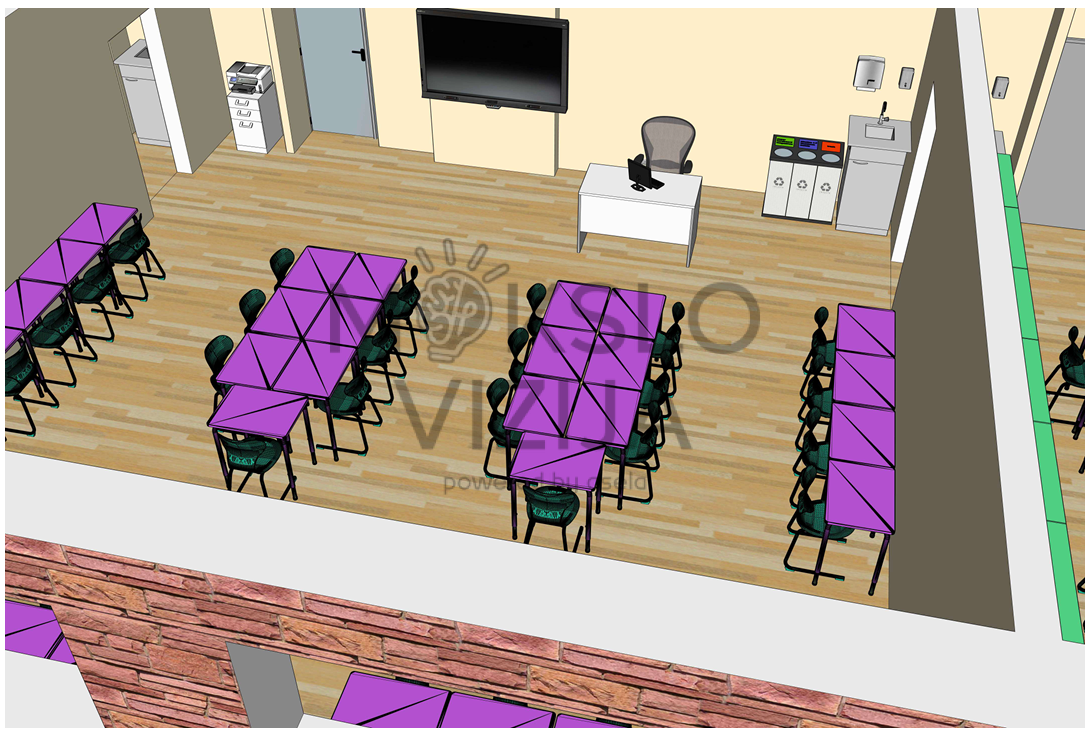 Darbo vietos išdėstytos grupėmis ir eilėmis, sudarant sąlygas tiek individualiam darbui, tiek komandiniams projektams. Toks išplanavimas leidžia patogiai vykdyti programavimo, robotikos, skaitmeninio dizaino, modeliavimo ar kitus STEAM užsiėmimus, o mokytojas gali lengvai stebėti mokinių ekranus ir darbo eigą visoje klasėje. Aiškūs praėjimai užtikrina saugų judėjimą ir patogų klasės valdymą.