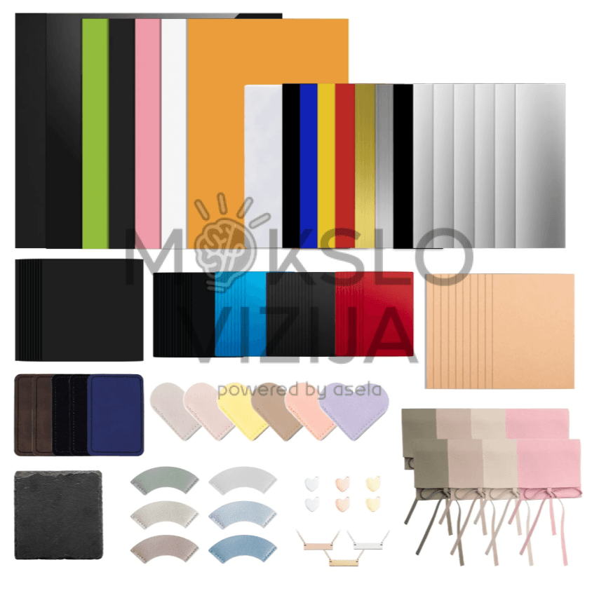 Komplekte esantys ruošiniai apima dažniausiai naudojamas kategorijas, tokias kaip akrilas, fanera, dviejų spalvų plokštelės, veltinis, oda, popierius, metalas, akmuo ir kitos praktinės medžiagos, kurios leidžia atlikti tiek graviravimo, tiek pjovimo bandymus. Rinkinys ypač naudingas mokymui, kai reikia vieno komplekto skirtingoms užduotims, nuo kontrasto ir graviravimo gylio palyginimo iki mažų projektų, pavyzdžiui, ženkliukų, etikečių, dekoracijų ar prototipų.