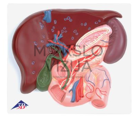 Modelyje detaliai pavaizduotos pagrindinės anatominės struktūros, tokios kaip kepenų skiltys, tulžies pūslė, ekstrahepatiniai tulžies latakai bei kraujagyslės. Tokia struktūra leidžia studentams geriau suprasti tulžies nutekėjimo kelią ir kepenų funkciją virškinimo sistemoje.