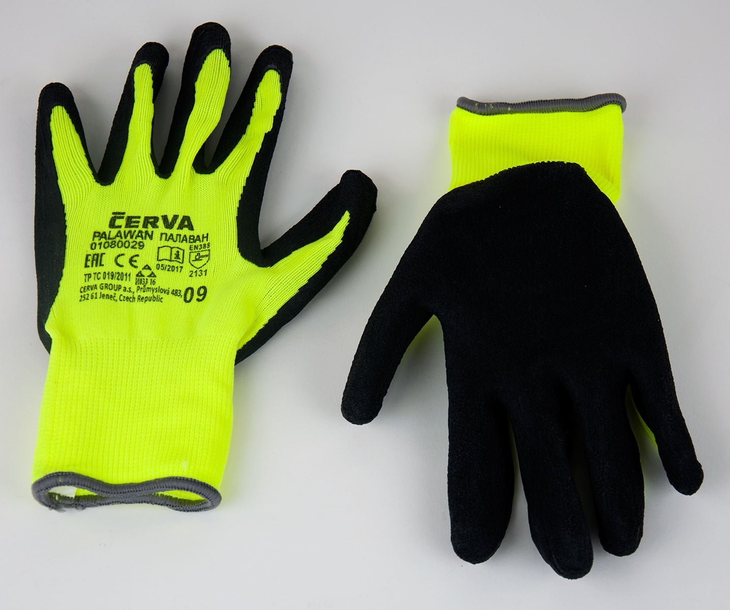 Pagamintas iš besiūlės megztos pagrindo medžiagos su latekso danga ant delnų ir po pirštais;