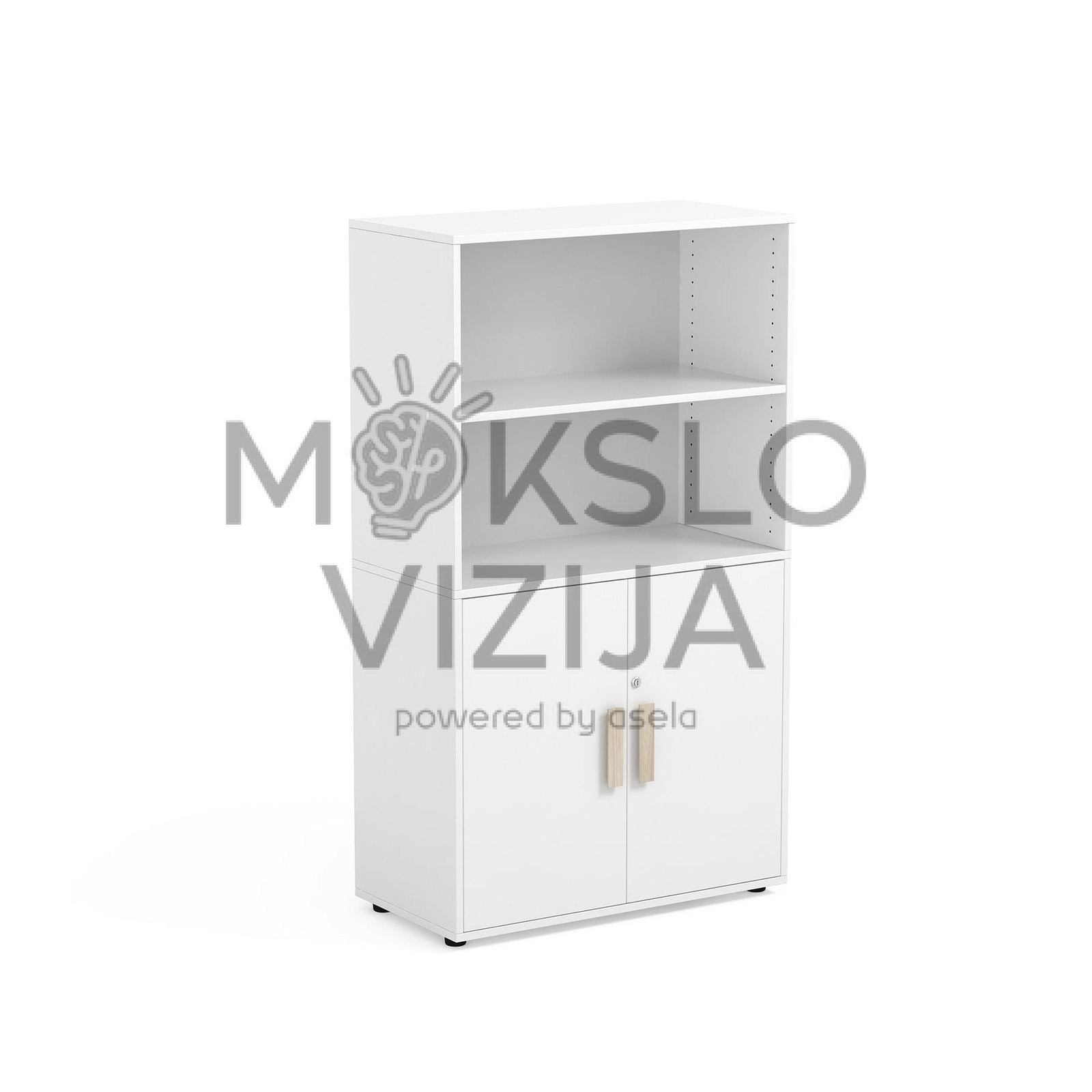 160 cm aukščio mokyklinė spinta su dviem lentynomis viršuje ir dvejomis durelėmis su erdvėmis apačioje. Puikiai tinka įrengti mokymosi klases.