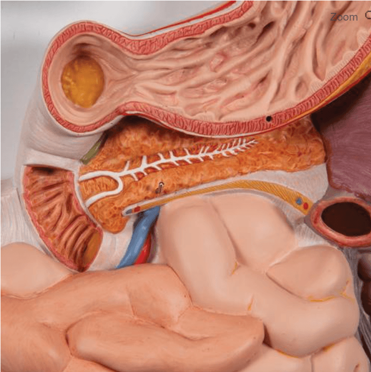 Modelyje aiškiai pavaizduoti burnos ertmė su liežuviu, ryklė, stemplė, skrandis su matomais gleivinės raukšlėmis, kepenys su tulžies pūsle, kasa, dvylikapirštė žarna, visa plonoji žarna ir visa storoji žarna. Vidinė skrandžio struktūra atsidengia nuėmus vieną iš nuimamų dalių, leidžiant išsamiai susipažinti su skrandžio anatomija, įskaitant gleivinę, prievartį ir įėjimo dalį.