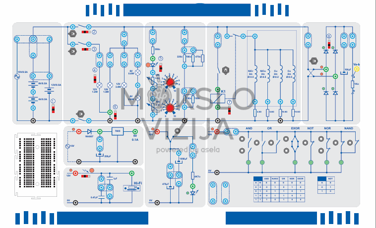 Komplektacijoje taip pat numatomas komponentų rinkinys, skirtas praktiniams jungimams ir matavimams, įskaitant įvairių reikšmių rezistorius, kondensatorius, skirtingų tipų diodus, lygintuvo tiltus ir integrinius loginius elementus, todėl mokymas gali vykti su realiais komponentais ir realiomis matavimų situacijomis.