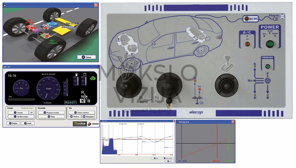 Įrangą sudaro mokomasis valdymo pultas su aiškiai pavaizduotais hibridinės transporto priemonės komponentais bei virtualus prietaisų skydelis, skirtas duomenų generavimui, įsigijimui ir išsamiai analizei. Mokymosi metu galima stebėti energijos srautus, valdymo logiką ir sistemos reakcijas į skirtingas važiavimo situacijas, todėl lengvai suprantamas hibridinės pavaros darbas įvairiuose režimuose. Virtuali aplinka suteikia galimybę atlikti konceptualius bandymus, keičiant parametrus ir lyginant rezultatus, o tai padeda įtvirtinti teorines žinias per praktinį taikymą.