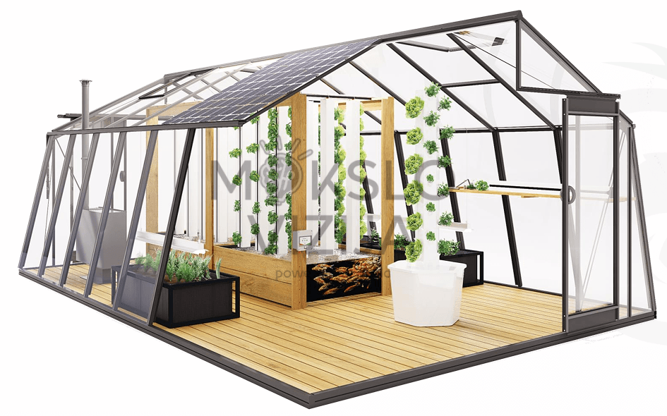 Akvaponikos modulyje įrengtas 300 litrų HDPE žuvų baseinas ir 4000 l/h našumo DC 30 W panardinamas siurblys su nuotoliniu valdikliu, leidžiančiu reguliuoti srautą. Taip pat yra „Feed“ funkcija, kuri sustabdo siurblį 10 minučių, kad būtų patogu atlikti filtro priežiūrą. Augalų auginimui komplekte pateikiamos Zipgrow™ vertikalios bokštų sistemos (8 mažos ir 3 didelės), skirtos maistinių augalų auginimui.