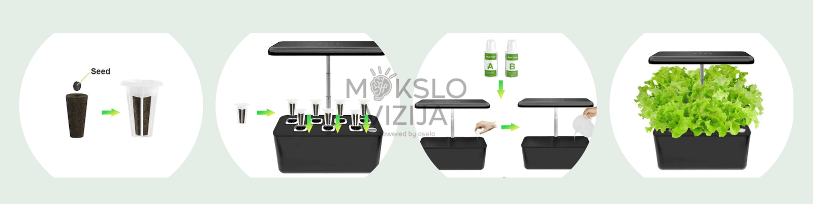 Kompaktiška hidroponinė auginimo sistema su integruotu pilno spektro LED apšvietimu, skirta augalų auginimui patalpose be dirvožemio. Įrenginys turi 4 l vandens rezervuarą ir 7 sodinimo vietas, todėl vienu metu galima auginti kelis augalus – prieskonines žoleles, salotas ar kitus žalumynus. Integruotas vandens siurblys užtikrina cirkuliaciją pagal laikmatį, o automatinis žemo vandens lygio priminimas padeda palaikyti stabilias auginimo sąlygas. Dėl reguliuojamo aukščio konstrukcijos sistema prisitaiko prie augalo augimo etapų ir tinka tiek daiginimui, tiek tolesniam auginimui.