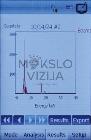 Elementų analizės diapazonas: K, Ca, Ti, V, Cr, Mn, Fe, Co, Ni, Cu, Zn, As, Se, Rb, Sr, Zr, Nb, Mo, Ru, Rh, Pd, Ag, Cd, Sn, Sb, Ba, Ta, Hf, W, Re, Ir, Pt, Au, Hg, Pb, Bi