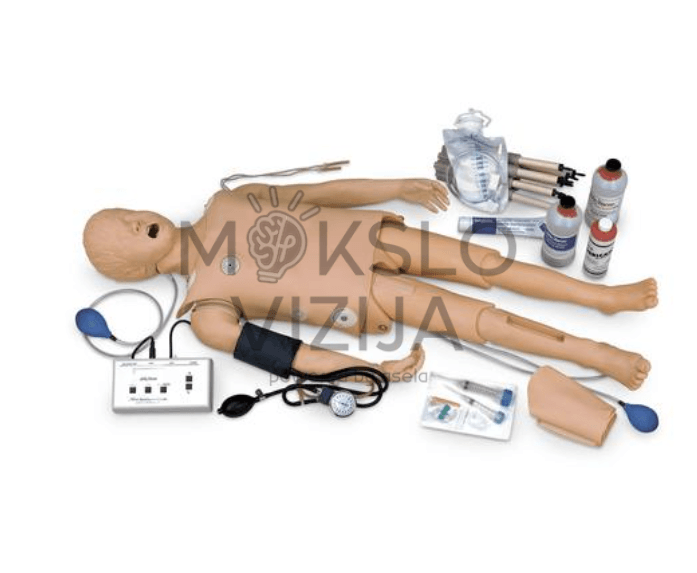 - Komplektacija: manekenas, integruotos funkcijos (IV/rankos, BP/ranka, femor ir IO prieigos, defibriliacijos odos sluoksnis)